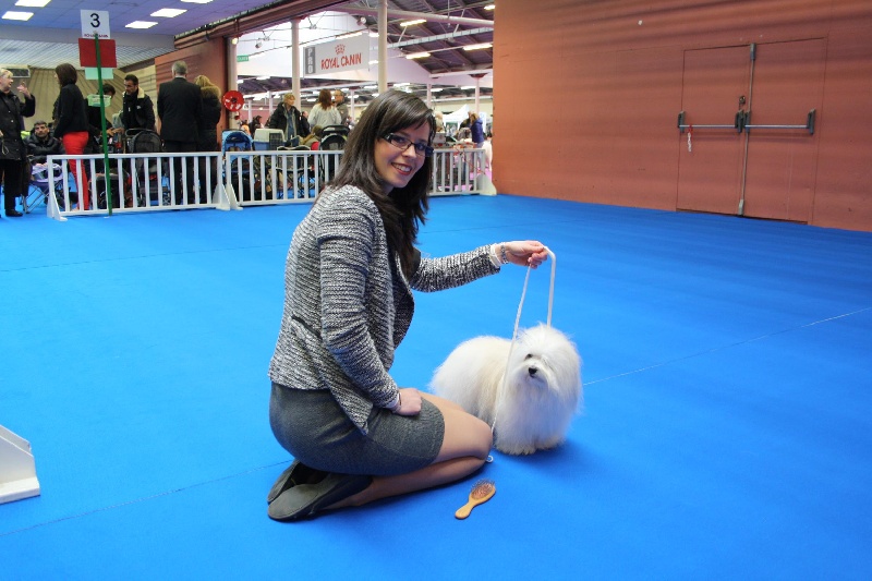 Tête féminine avec oeil foncé, bonne longueur de chanfrin, DCC, bonne sortie d'encolure, poitrine large et solide, TB avant main, angulation d'épaule correcte, dos solide de forme corrcet, bonne longueur fouet, bonne texture, se déplace bien, la queue n'est pas toujours bien portée, le blanc pourrait être plus pur.